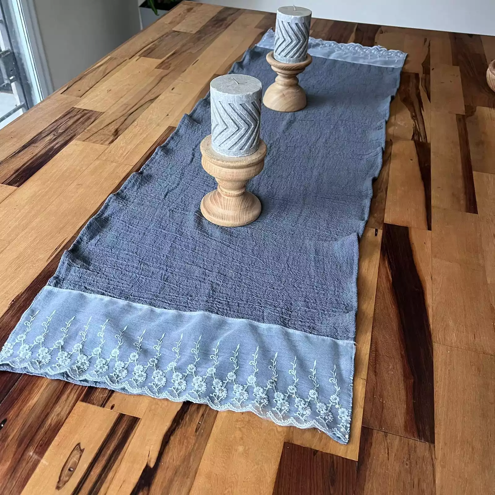 Camino de gasa gris con puntilla transparente 1,38 x 0,46 ideal para decorar tu hogar con estilo cálido y moderno. Producto funcional y decorativo, perfecto para cualquier ambiente. Envíos a todo el país desde El Galpón de Antonia.
