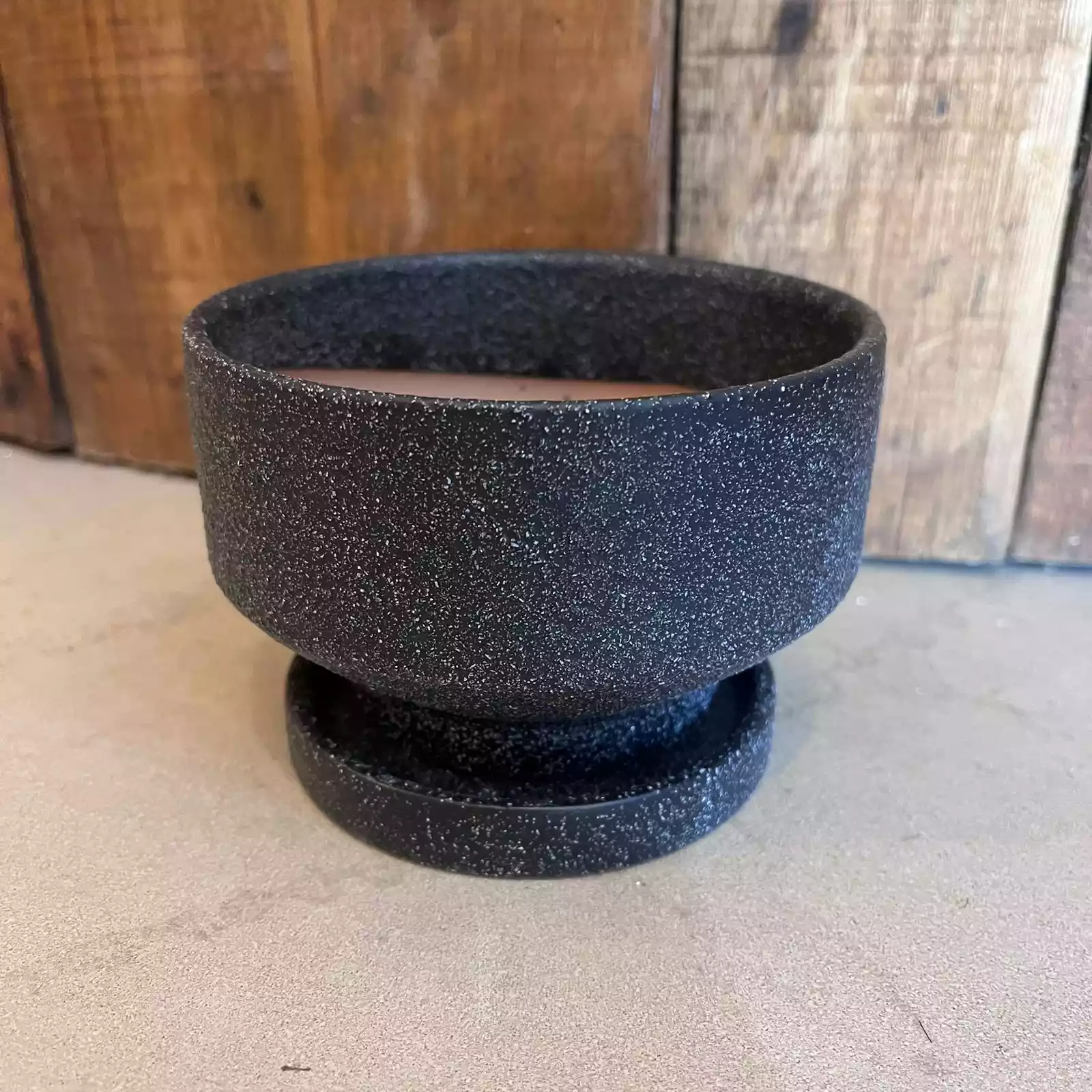 Maceta cemento texturado 12cm con plato de base negro mate ideal para decorar tu hogar con estilo cálido y moderno. Producto funcional y decorativo, perfecto para cualquier ambiente. Envíos a todo el país desde El Galpón de Antonia.